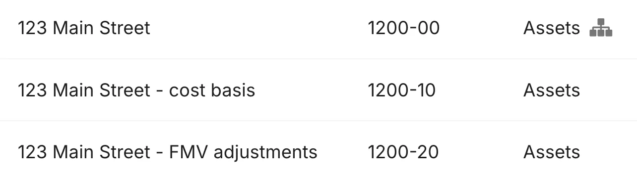 Each balance sheet item gets the right valuation method, sub-accounts, and cost tracking, whether it’s a brokerage account, rental property, or promissory note.
